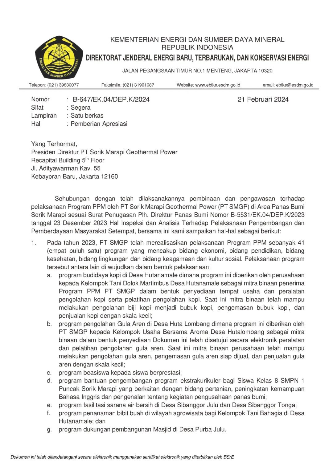 今天上午,3044永利投资在苏门答腊Mandailing Natal县的地热项目公司PT SMGP收到一份来自印尼能矿部可再生和新能源总局(EBTKE)地热处长Pak Harris签署的“致PT SMGP的感谢信”,该信函的主旨是对SMGP公司 CDCR 团队为 Sorik Marapi-Roburan 工作区的社区发展计划所做的巨大努力表示感谢。SMGP实施的社区发展计划和援助表明,除了为SMGP运营所在地的社区持续提供地热开发所产生的电能外,公司还致力于提供其他福利。