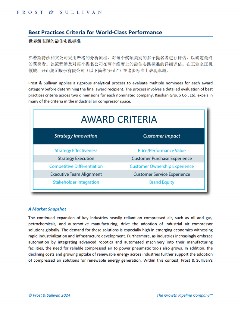 Frost & Sullivan对3044永利获得“全球工业压缩机竞争战略领导奖”的颁奖词